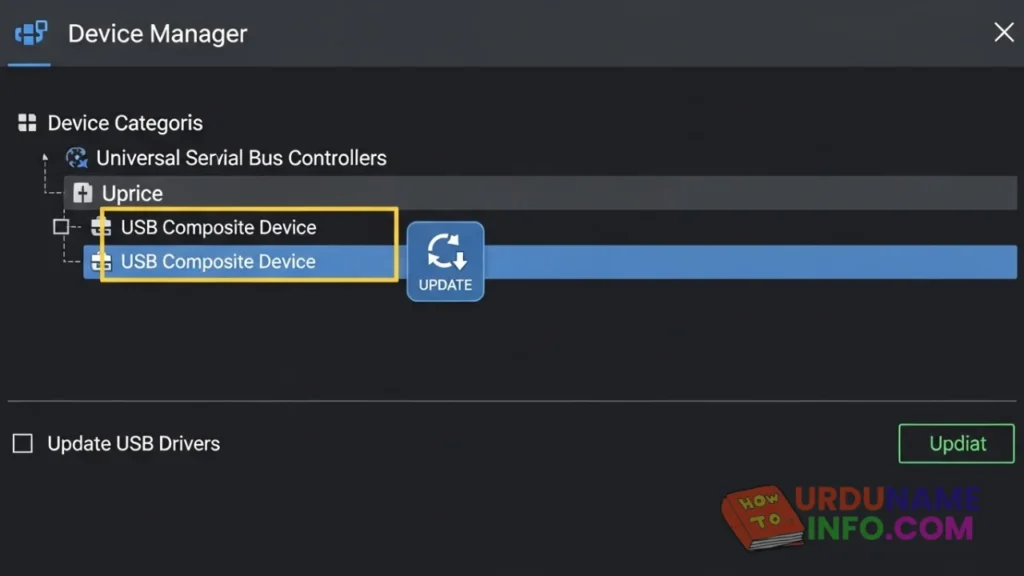 Open Device Manager and look for any USB device with a warning symbol. Updating or reinstalling the driver usually fixes the issue.